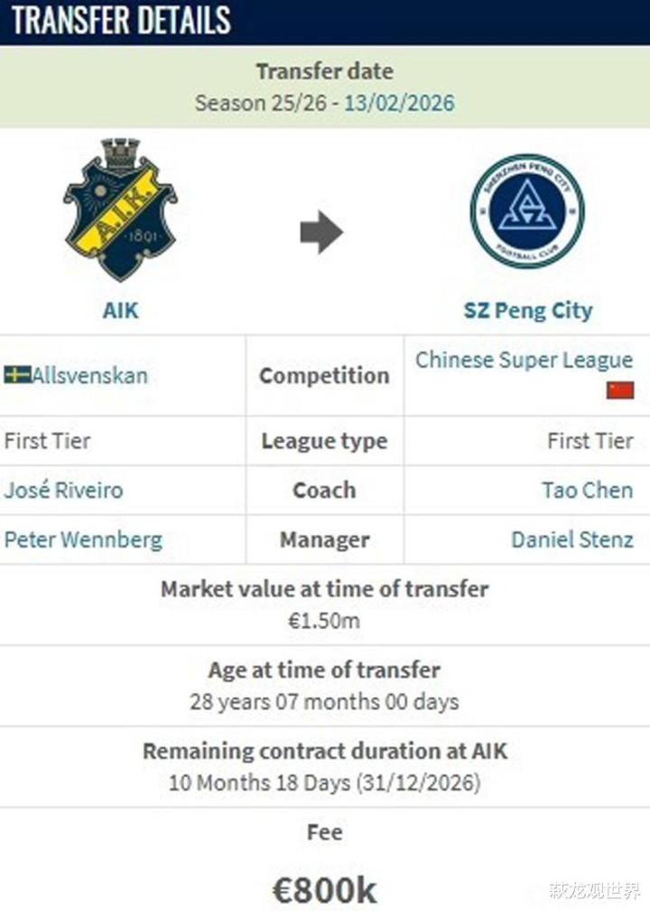 德转炫耀,当今本科维奇的身价为150万欧元。从AIK索尔纳加盟深圳新鹏城的转会费为80万欧。