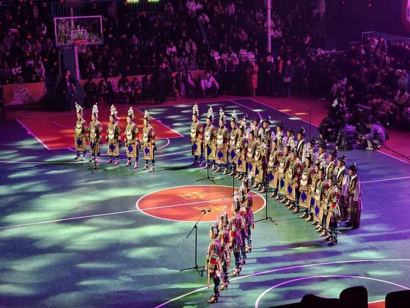 1月23日,贵州黔东南。在黔东南“村BA”“王中王”冠军赛现场,村民带来侗族大歌饰演。刘胤衡/摄
