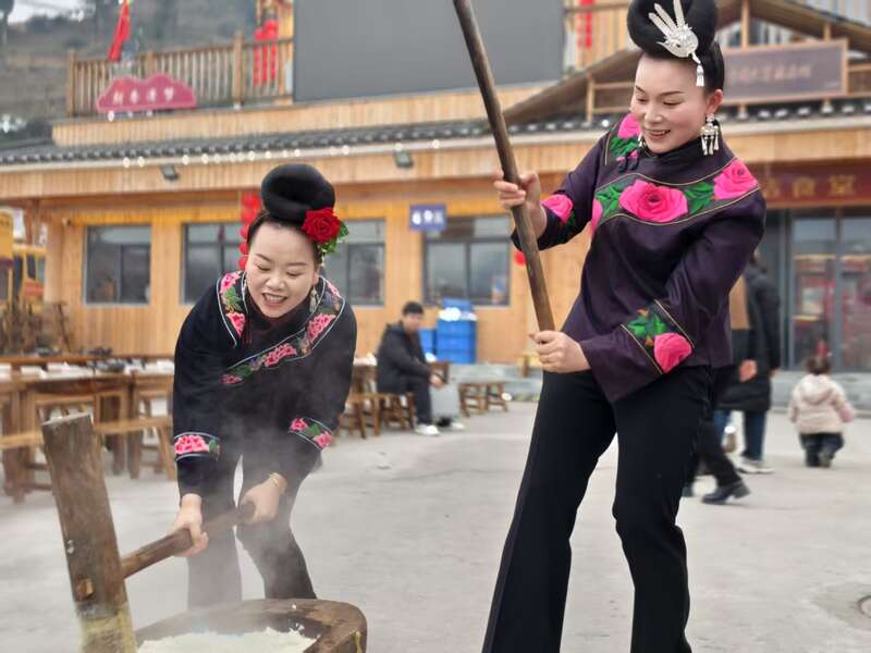 1月23日,贵州黔东南。“村BA”欢腾购大集上,苗家阿妹打糍粑。刘胤衡/摄
