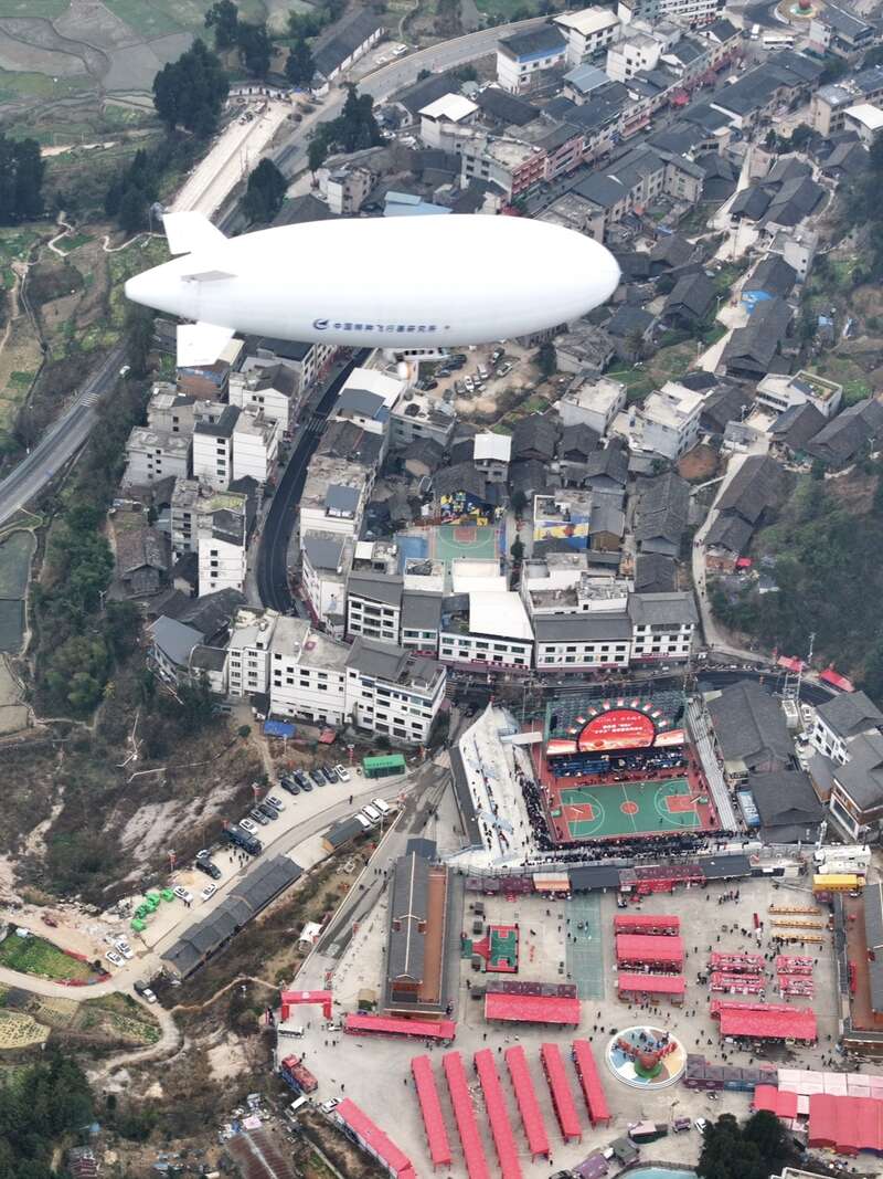 1月22日,贵州黔东南。我国自主研发的AS700“祥云”载东说念主飞艇飞过黔东南“村BA”“王中王”冠军赛现场。中国航空工业集团供图