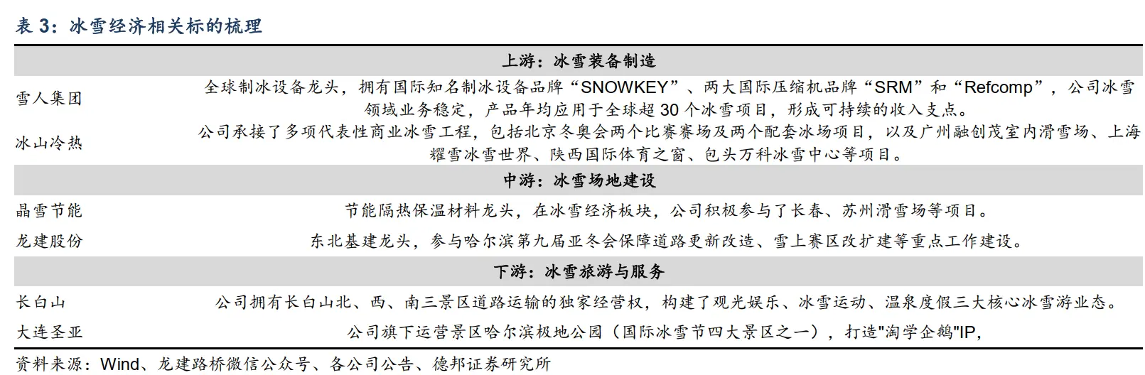 中游:冰雪局势配置与运营赛谈。中游冰雪局势配置与运营赛谈涵盖冰雪局势配置及冰雪旅游职业、开放职业、文旅交融等运交易务,呈现南北互异化发展特征。中枢方针以晶雪节能、龙建股份为代表。