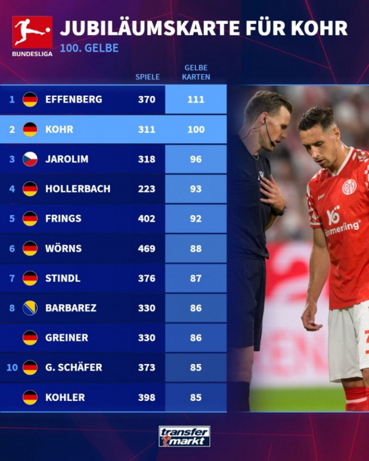 直播吧10月7日讯德国转会阛阓统计了球员在德甲联赛中吃到黄牌的数目,比肩出榜单,埃芬博格111黄居首,科赫100黄次席。